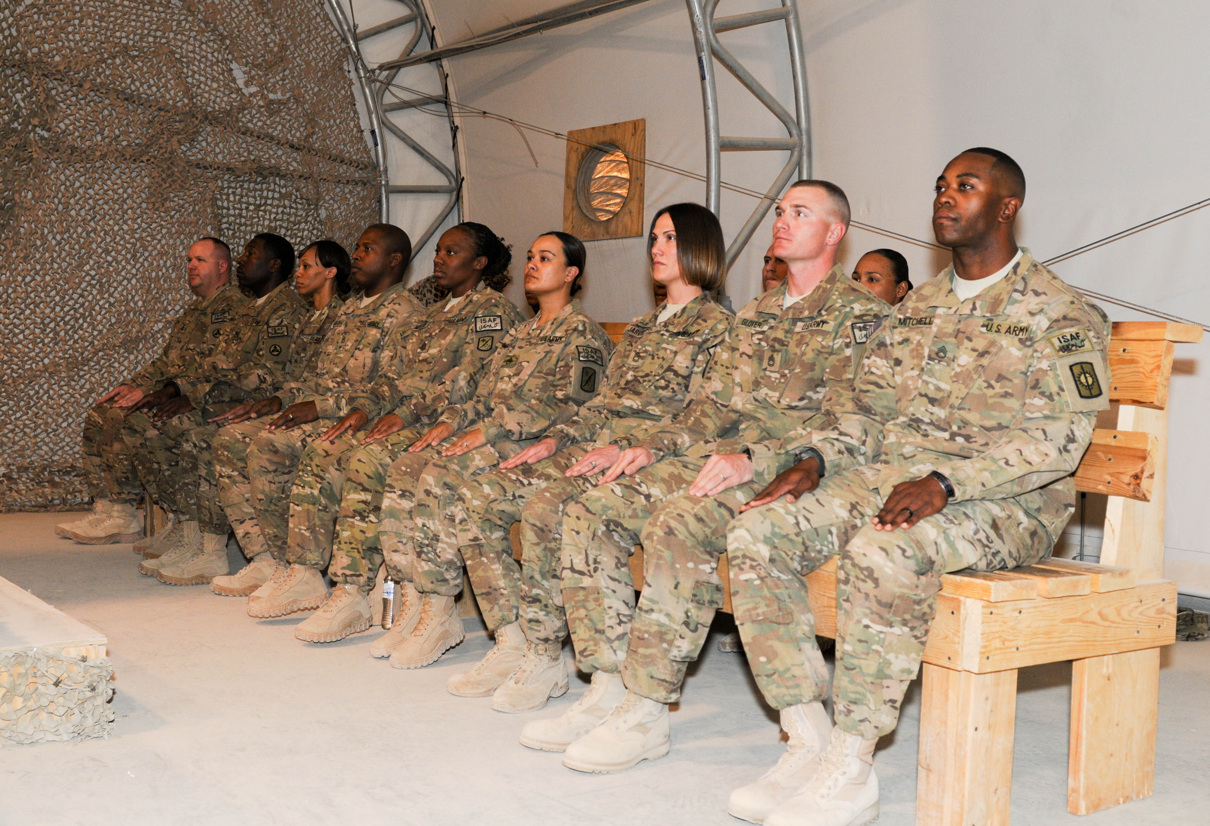 The newest inductees of the Joint Sustainment Command – Afghanistan chapter of the Sergeant Audie Murphy Club wait to receive their Sergeant Audie Murphy medallion during a ceremony on Nov. 25, 2012 at Kandahar Airfield, Afghanistan. (U.S. Army photo by Staff Sgt. Michael Behlin)