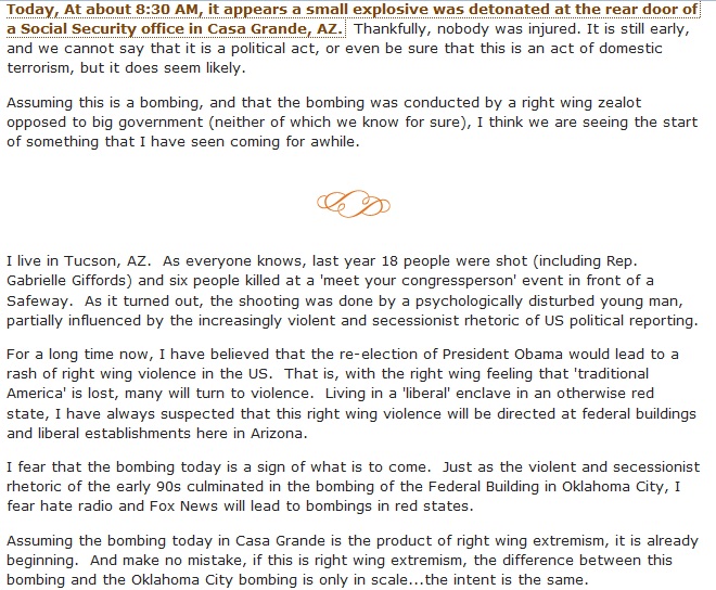 So here’s the breathless reporting from some dingus who calls themself Empty Vessel at Daily Kos, about the bombing at a Social Security Office in Casa Grande, AZ;