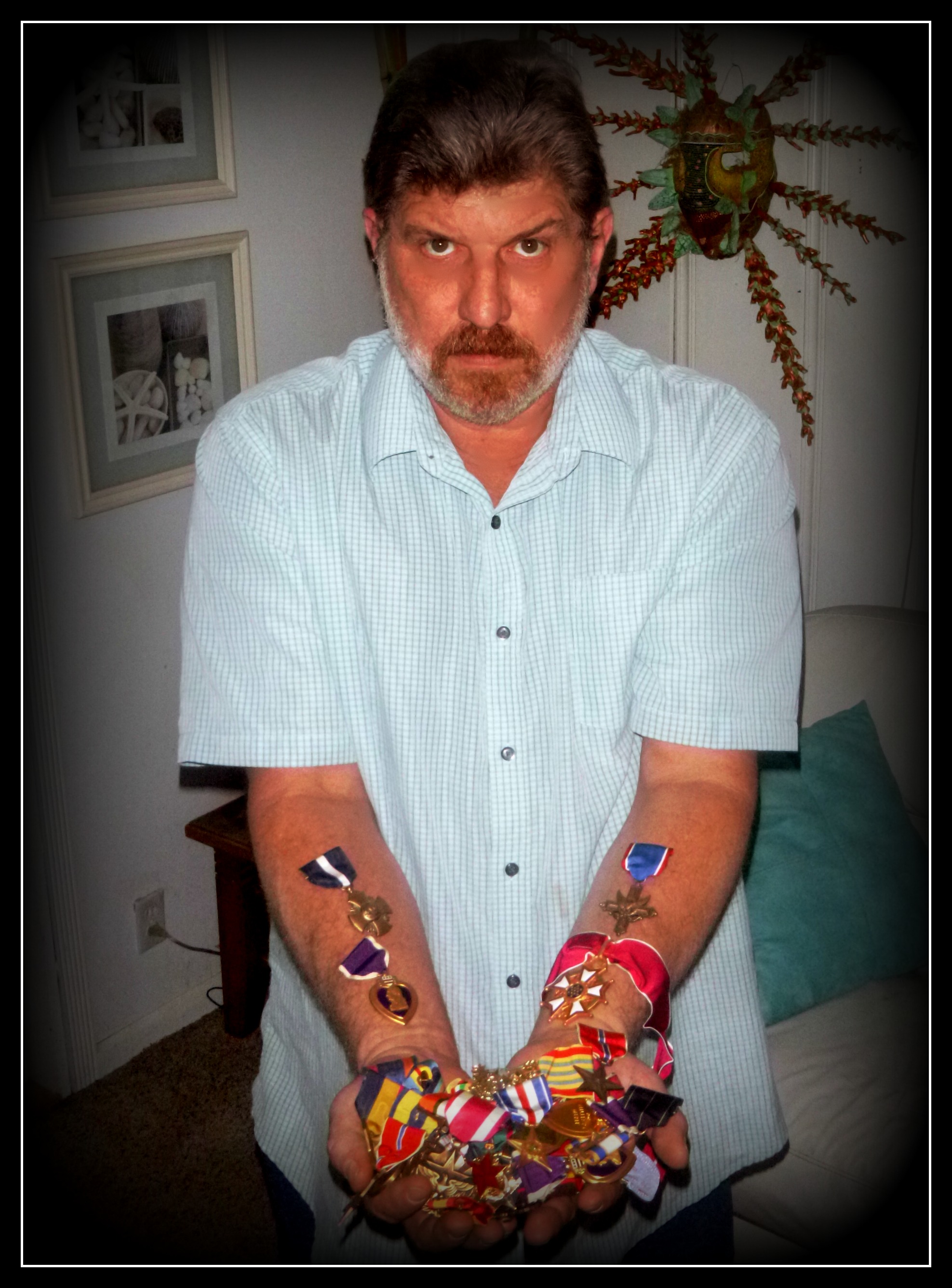 At the bottom of the photo on the floor, near the center of that shit pile, the red and yellow with stripe medal, is a Republic of Vietnam, South Vietnam Air Force Northern Expeditionary medal. How in the hell would he earn that one. Given to RVN pilots who flew north of the DMZ if I remember correctly. I know…they are less then $50 on sites all over the internet. So he is also a RVN secret squirrel pilot. Glad he’s busted. Stupid is as stupid does.