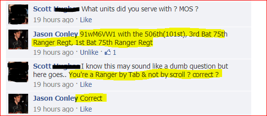 Scotty sends us a link to his latest bust – one Jason Conley, who claimed that he is a Ranger-qualified medic – that his MOS reads more like a Vehicle Identification Number than a Military Occupational Specialty; 91wM6VW1. And, oh, he has three deployments;