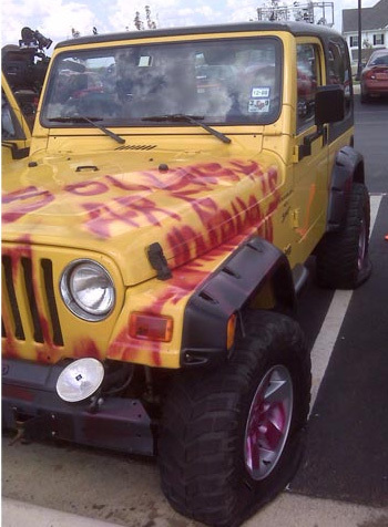The vandals used a box cutter to destroy the inside of his jeep, they slashed five tires and smashed through the windshield. Perhaps the most shocking detail to the vandalism was the message spray painted on his hood.