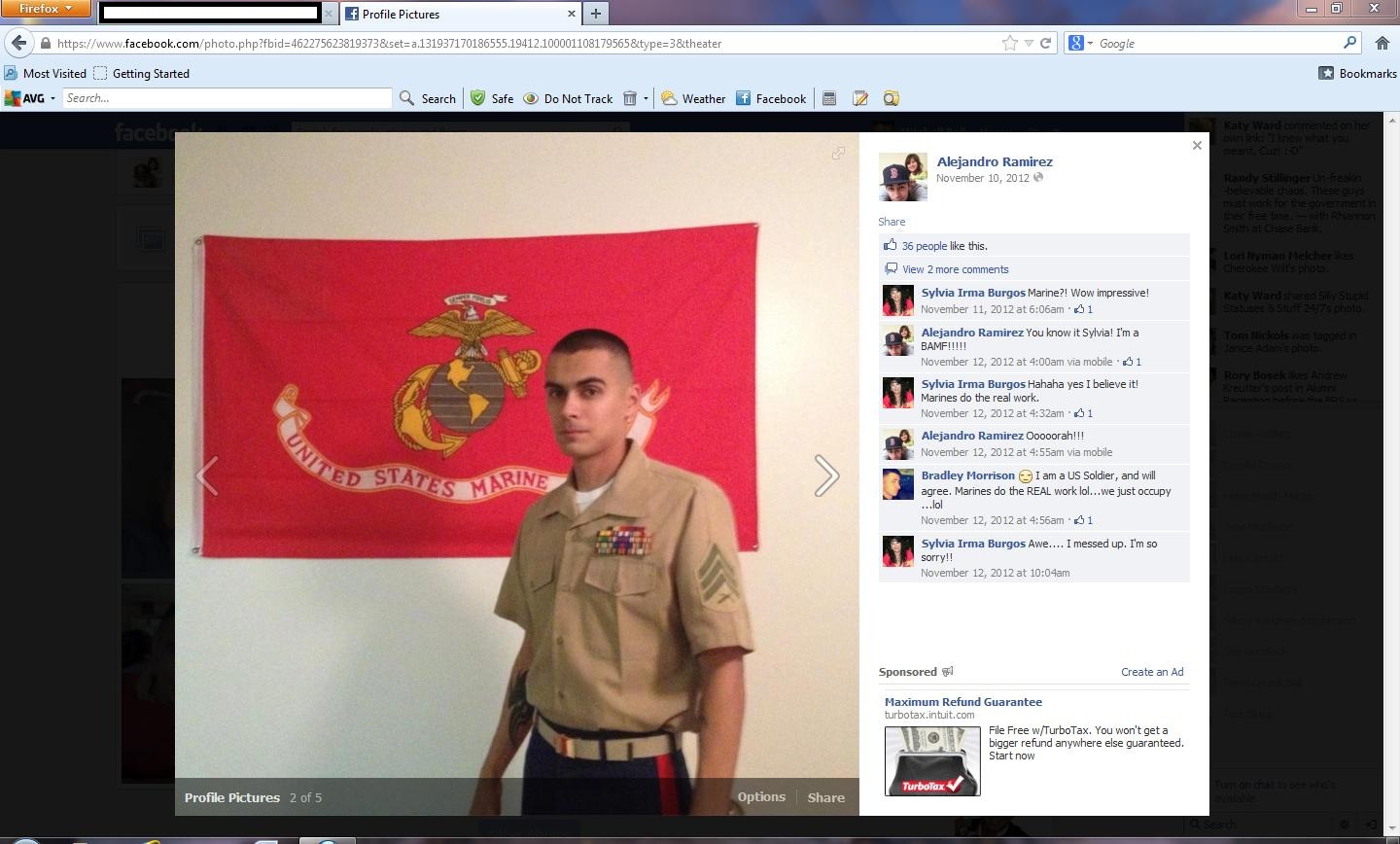 Our buddy, Taco Bell, sends us the screen shots he took of Alejandro Ramirez’ Facebook page in which he claims he was a Marine until he “caught the PTSD” as we say around here, and the Corps forced him out. The only problem is that Taco, a Marine officer, couldn’t find a record of him anywhere;