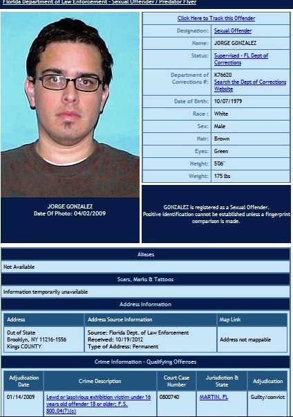 I can’t find his name on the list of sex offenders. I don’t know what the laws of Florida or Washington State are regarding registering as a sex offender, but I do know that he’s not on the list, Someone said he’s living in New York State now, but I don’t see his name on their sex offender list. There are a couple of them named Jorge Gonzalez but they’re not him. Someone in the New York State Police ought to stop arresting veterans on gun charges for a minute and chase down the real dangerous criminals for a change.