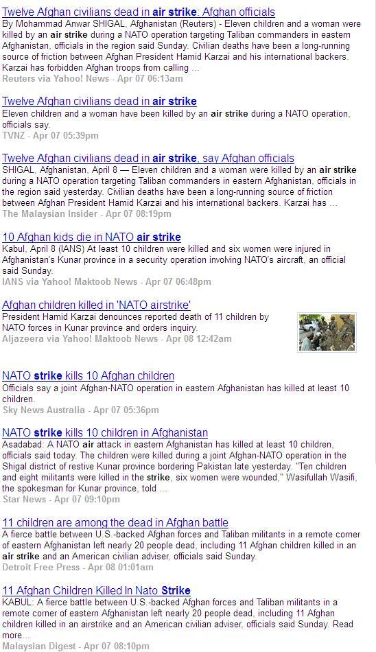 Stars & Stripes reports that an airstrike called in to relieve beleaguered NATO troops killed 10 children and a woman along with 11 Taliban fighters at a Taliban base Saturday.
