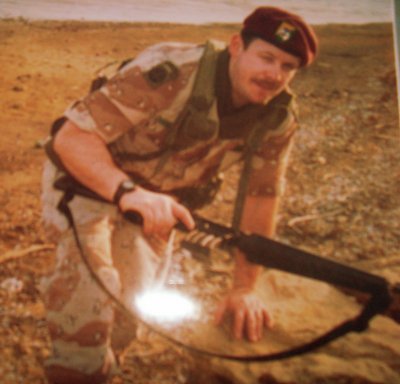 This is supposed to be him, too and it might be, because his beret is still leaning towards his Left ear, but this guy has an 82d combat patch. I’m not sure if Air Force folks are supposed to have combat patches, especially Army unit combat patches. Of course, he might have been prior service, because the uniform is the old “chocolate chip” desert BDUs, but, I don’t know of any NCO in the 82d who would let someone run around with that jacked-up beret. And a beret isn’t a field uniform, neither is having rolled up sleeves – rolled up the Army way. And the picture maybe backwards. Most men wear their watch on their left wrist, and it looks like the magazine eject button is on the wrong side of the rifle.