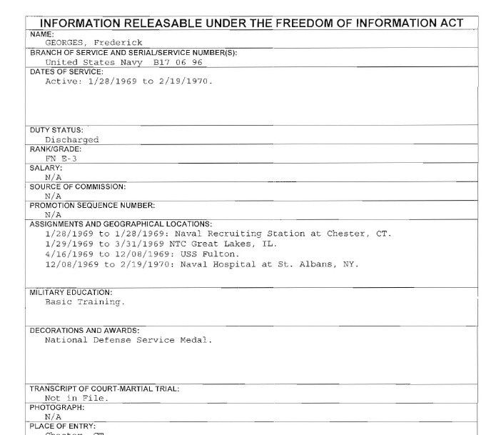 Since he was nice enough to use his serial number, getting the FOIA was made that much easier, thanks Frederick. So he spent a whole thirteen months in the Navy. He was assigned to the USS Fulton, AS-11, a submarine tender. According to the history of the boat, ship, floater, during the time Georges was assigned to it;