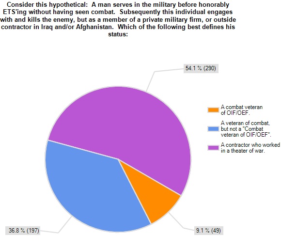 Its all a side show anyway. Who is a combat veteran is the real question. Is some 92A who’s deployed to JBB Balad a combat veteran because he was rocketed one day? How about the 11B who spends his entire deployment at some JCOP training local national’s but never sees any action? How about a contractor who is in a firefight while employed by the Federal Government (doing the jobs they don’t trust Joe to do)?