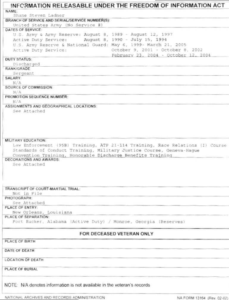 You probably remember Shane Ladner from a few weeks ago, the fellow who had claimed he had a Purple Heart which got him a spot in a white-tail hunt and then a seat on a float in a Veterans’ Day parade which collided with a train in Midland, TX and cost his wife her leg. And then our buddy, Randy Travis at an Atlanta news station discovered that he hadn’t really earned a Purple Heart. In fact, he’d been lying about his entire career which had him wounded in Operation Just Cause in Panama, but when that lie didn’t pan out, he was suddenly secretly wounded in Honduras. Well, it looks like he was indeed in Honduras according to the records that Mary sends us from the National Personnel Records Center;
