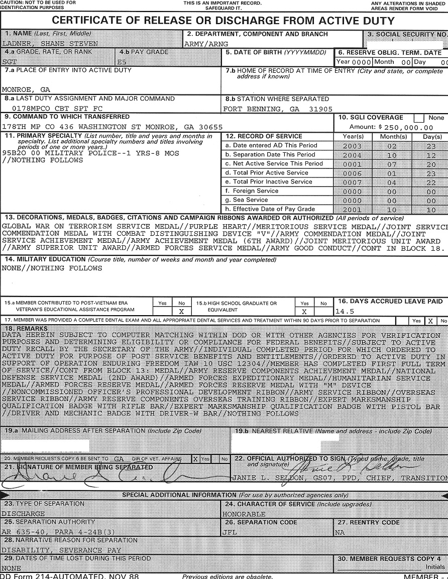“Ladner’s attorney said one thing he found interesting was there was no DD-214 for when Ladner separated from active duty in 1997, only from his discharge in 2004.”