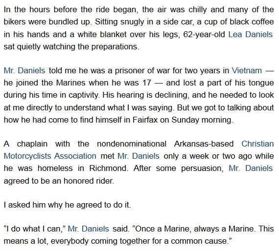 I’ve written to the author of the article and to the Christian Motorcyclists Association whose chaplain asked him to be their “honored rider” to see if anyone had checked his story out. I heard back from someone at CMA a few days after I emailed, and they said they’d check on it, but I never heard back. Nothing from the Washington Times writer, either.