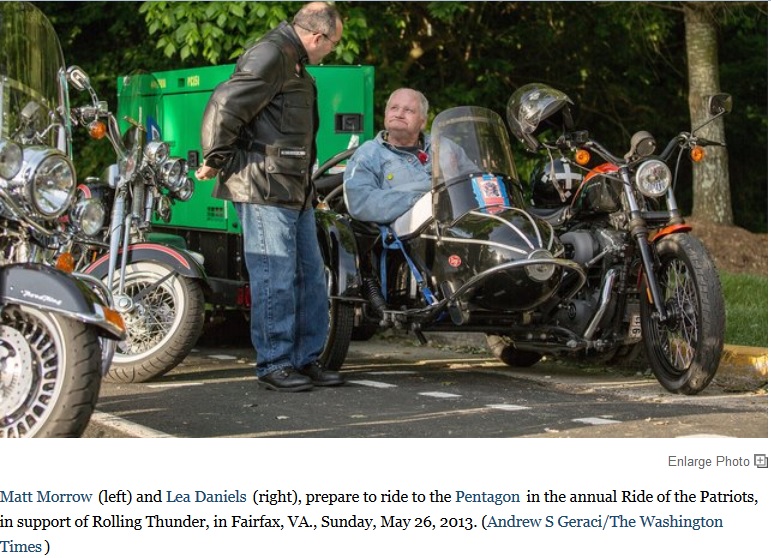 All I wanted to do was read a nice story about Rolling Thunder on Memorial Day, and so I opened up the Washington Times and started reading the words of Meredith Somers, a Times reporter who rode with a local club to the Pentagon from their Northern Virginia staging area. but then I ran across this part of the missive;
