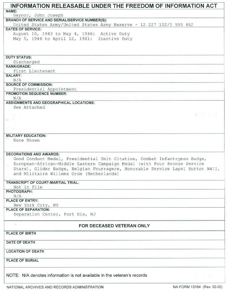 According to the FOIA, he joined the Army, not in 1942, but 1943. And it looks like he stayed in the Reserves and never deployed to Korea and left the service as a 1LT, no jump wings. According to his assignments, he wasn’t assigned to the 82d (325th Glider Infantry) until November 1945, six months after the war, three years before the glider infantry units were disbanded and reconstituted as parachute regiments.