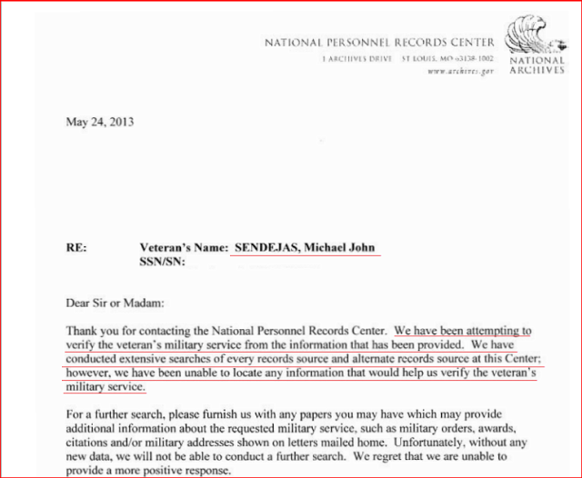 I thought that, because he wasn’t claiming all kinds of wild medals and ranks that he might be in the Guard or something, which would explain why the NPRC would have his records if he was still on active duty ot the Guard, but, nope, nothing on AKO for anyone with a name even even similar to his. There were eight Sendejas, none were E-4s and none had any variation of “Mike” in their names.