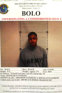 Someone sent us the wondrous tale of Freedom Douglas Stansbury, who they tell me has been hanging around the gym at Eglin Air Force Base pretending to be an Army Captain at EOD school – they tell me that captains don’t attend the school at Eglin. But, apparently he’s been chewing out NCOs at the gym for doing exercise improperly and for being fatbodies. Apparently, he’s just some New Jersey hoodrat with a lower enlisted girlfriend who signs him into the post. But above you can see the poster that Eglin Law Enforcement issued on him.