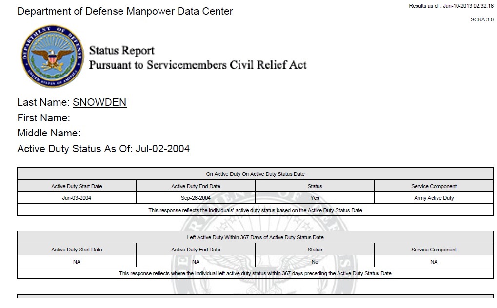 DrewM sent us a link this morning about the guy who supposedly fed the NSA’s data mining story to Glenn Greenwald last week. And while I do believe that the NSA has been collecting information on completely innocent American citizens inside our borders, I’m not sure this Snowden dude is who he says he is. We’ve applied for a FOIA on his records, but here are my impressions of what he says about his military career. First from the Guardian and Greenwald;