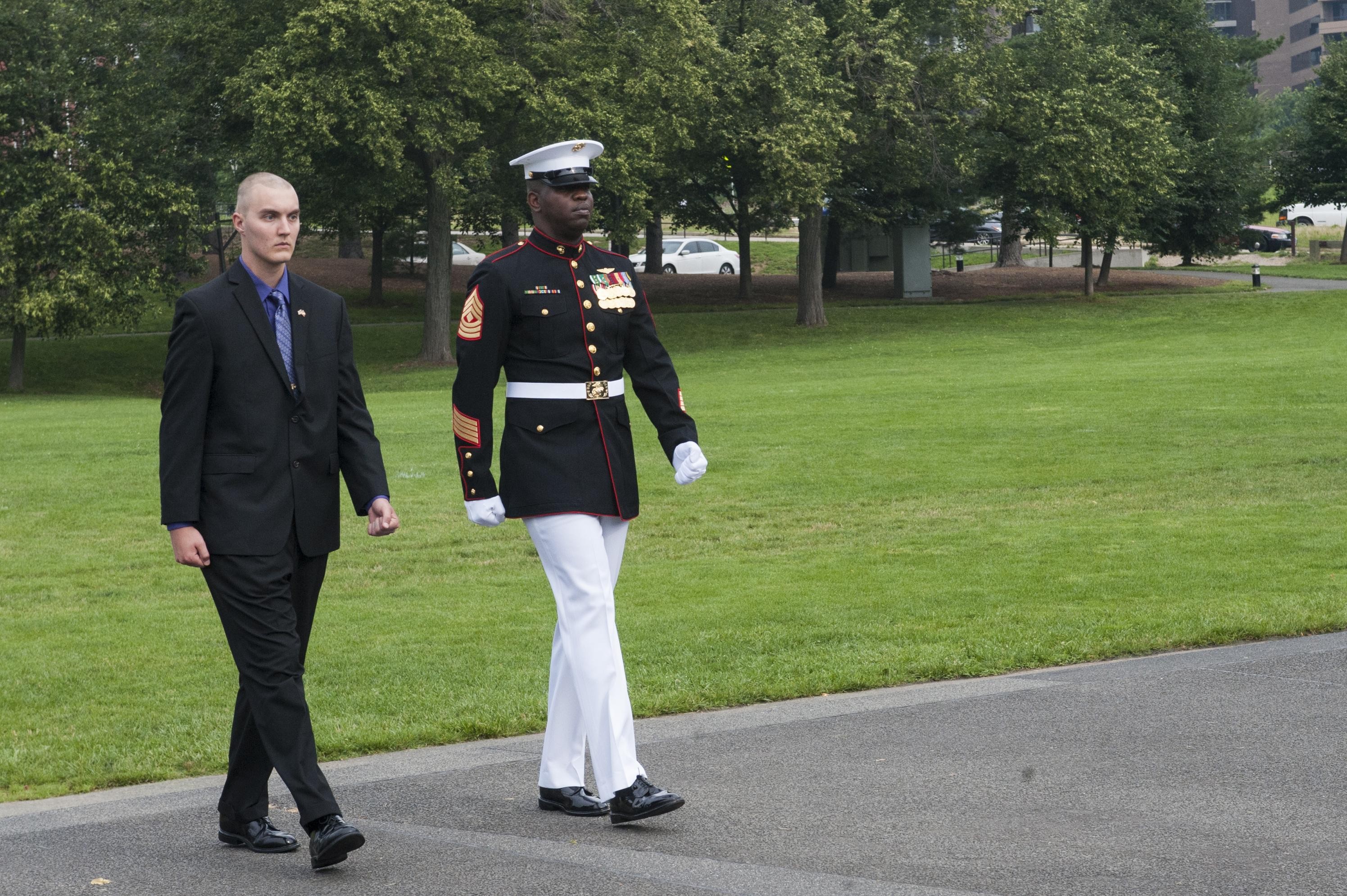Arlington Va. U.S. – Daran Wankum, the 22nd honorary Marine in Marine Corps history, and 1st Sgt. Charles Peoples, Marine Barracks Washington, D.C., Guard Company first sergeant, march up to the Marine Corps War Memorial during a wreath-laying ceremony for Wankum in Arlington, Va., June 13. Wankum was named an honorary Marine on June 11….