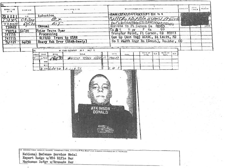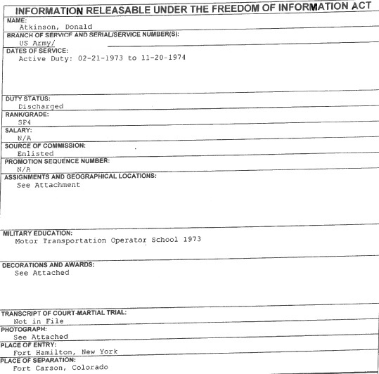 His FOIA says the he was discharged in November of 1974, the 1st Ranger Battalion wasn’t activated until August 1974 at Fort Benning, GA, then they moved to Fort Stewart, GA. According to Atkinson’s records, he was at Fort Carson, CO that month;