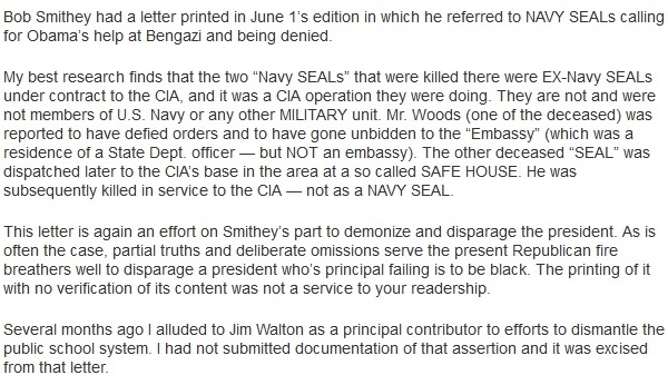 Stu sends us a link to a reader’s letter at the Pine Bluff Commercial Online which takes exception to an opinion column in the paper about the two SEALs who were killed in Benghazi. I’m not all that sure what his point is, it’s either that it’s OK to kill former-SEALs who work for the CIA or that it’s OK to kill former SEALs because the president is black;