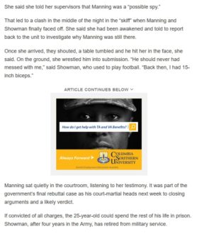 Seriously, WT actual F? Former Army Specialist Jihrleah Showman testified at Breanna Manning’s court martial that she suspected he would become a spy and reported that to her supervisors according to the Tribune;