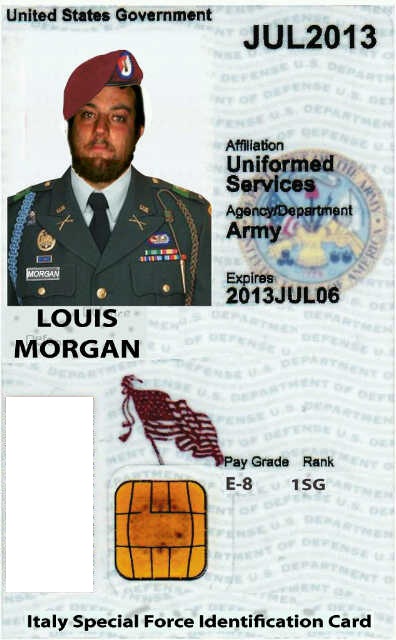 With CAC cards (and civilian PIV versions), all lettering is in the Arial or Arial Narrow font. Also, on the current-design CACs, look at the background with the guilloched “DEPARTMENT OF DEFENSE” wordmark in wavy lines. Notice that when 1SG Bagofass inserted his own name and fictional rank in there, the background DoD wordmark is cut/pasted in incorrectly.