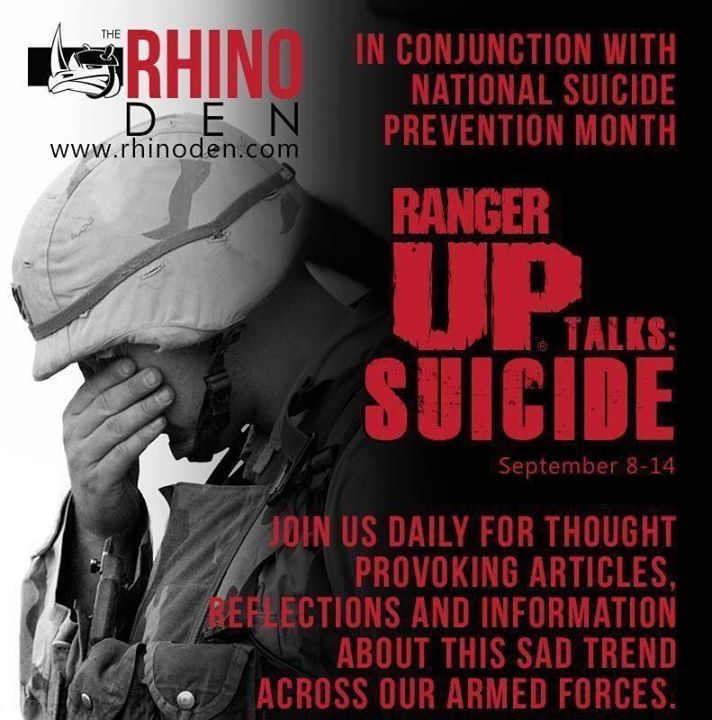 September is Suicide Awareness Month and to that end the folks at the Rhino Den, and Ranger Up are devoting a whole week, with two articles a day to bringing awareness to the issue of suicides. There will be active duty and Veterans attacking the issue from all angles and I hope you all tune in, and pass them around. It’s an important issue and we need to, as a community, start paying attention and taking action.