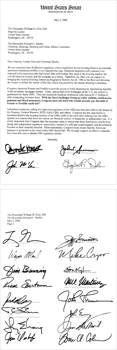 I picked this up from Marooned in Marin who got it from Human Events; a copy of a 2006 letter to the Senate Majority Leader and the Chairman of the Banking Committee calling for more regulation pf the GSEs (Freddie Mac and Fannie Mae). The letter includes John McCain’s signature;