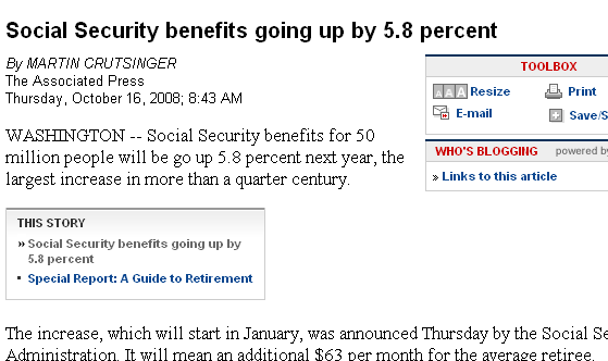 They fail to mention to the “me” culture that this isn’t a merit pay raise for being good social security recipients. It’s a cost of living increase based on LAST YEAR’s consumer price index. It jumped 7.4% in 1982 because that’s what the inflation rate was then, it’s gone only 1or 2% every year recently because that’s what inflation has been. I know it’s hard to give the Bush Administration credit for controlling inflation the last few years, AP, but cheezum crow….