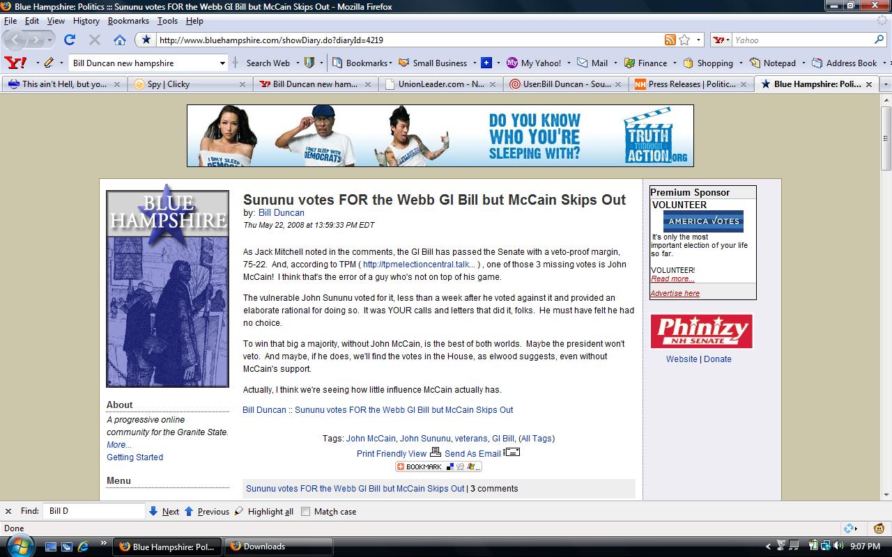Bill Duncan, who (like Ray Bradley!) claims to be a Vietnam vet, wants to “honor” us by spitting on what we did and what our friends have sacrificed for. While on the payroll (or masthead, at least, if he’s a volunteer) of a Congresswoman who steers defense money away from the troops and towards contractors that can kick back to her.