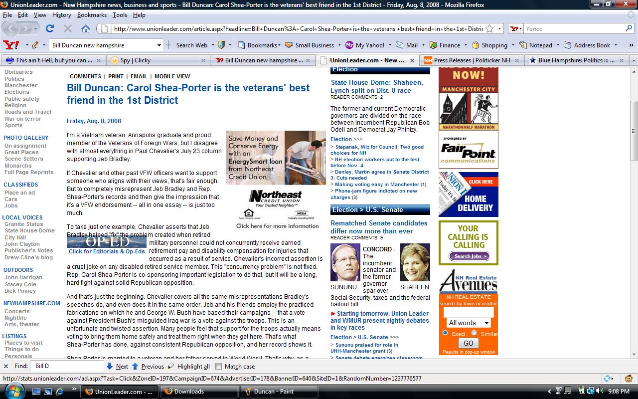 Now, on Carol Shea-Porter. Mrs. Lee and Mrs. Healy campaign in support of the war in Iraq. They may well want to campaign against Congresswoman Shea-Porter because her opponent supports the war in Iraq and she doesn’t. But an effort to suggest that the Congresswoman is not responsive to communications from her constituents, particularly vets and military families, is bound to fail. She has wide support from veterans. She’s passed important legislation for vets. The VFW-PAC has endorsed her as a patriot strong on national defense. The Veterans and Military Families Project has endorsed her. The Iraq and Afghanistan Veterans of America have given her an A+ rating. The DAV has given her a 100% for 2007 (while Jeb Bradley got a 0% in 2004 and 2005). Veterans and families she has helped say things like “she has changed my life,” and “her constituency services is on a whole other level.” Her record on vets and constituents is just too strong to be assailed.