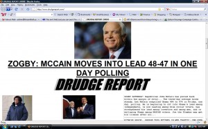 Drudge is running a headline that McCain moved ahead of Obama by a point – of course, it’s all within the margin of error, but nonetheless, here’s the headline;