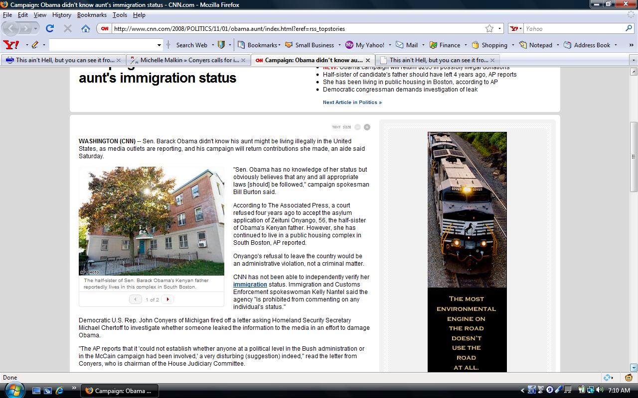 Of course Conyers could get just as outraged that a US Senator running for the Presidency had an illegal alien aunt living on the public dole. Or he could get outraged that this information hadn’t come out sooner by Obama’s own admission rather than reporters digging around in the final days of the campaign.