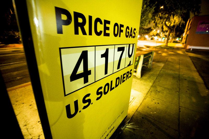 The sign they’re putting up refers to the antiquated empty-headed “War for Oil” slogan;
