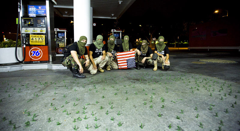 If I pulled into a gas station in the middle of the night and saw a group of men dressed like that acting in a psycotic way, they would be face down on the ground and held at gunpoint until the Po Po got there. They should use caution in small towns… they may actually earn some PTSD.