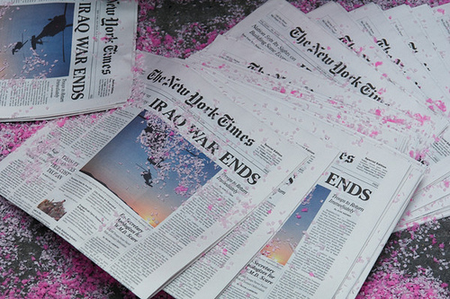 If you read Army Sergeant’s comment below about the “Yes Men”, you’re probably wondering to what she referred. Our buddy, DanNY wrote about it a few days ago. Well, these goofballs “Yes Men” printed a fake New York Times (odd, but the fake NYT is virtually indistinguishable from the actual newspaper in appearance as well as content) with this headline;