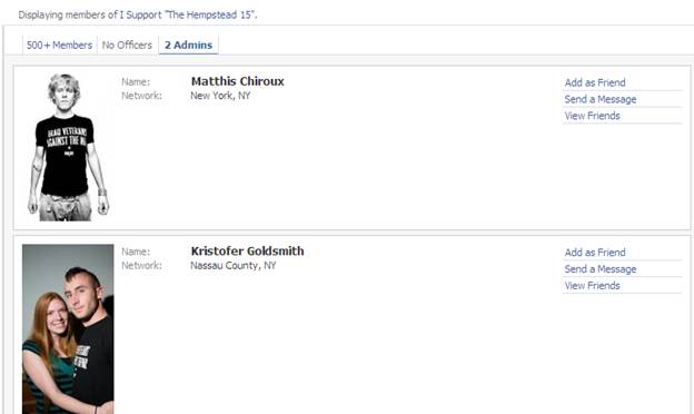 Now, I found that piece of shit above a little bit ago, and decided to see what would happen if anything. The so-called Hempstead 15 have their own Facebook site devoted to explaining how the fascist police of Nassau are all undercover stormtroopers led by Darth Cheney, and their death steeds are a menace to freedom loving people’s everywhere. The leaders of this website are none other than Chiroux and Goldsmith: