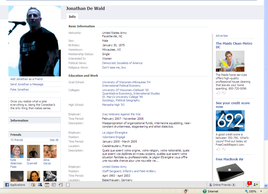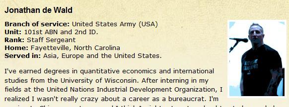 Well, Jonathan Paul DeWald is my current cigarette butt on the ground. The other day I called him out along with some other members of the IVAW for lying on his profile at the IVAW website where he lied about his rank (for what it’s worth, his profile is gone from the IVAW website now, but brought to you through the magic of screen capture);