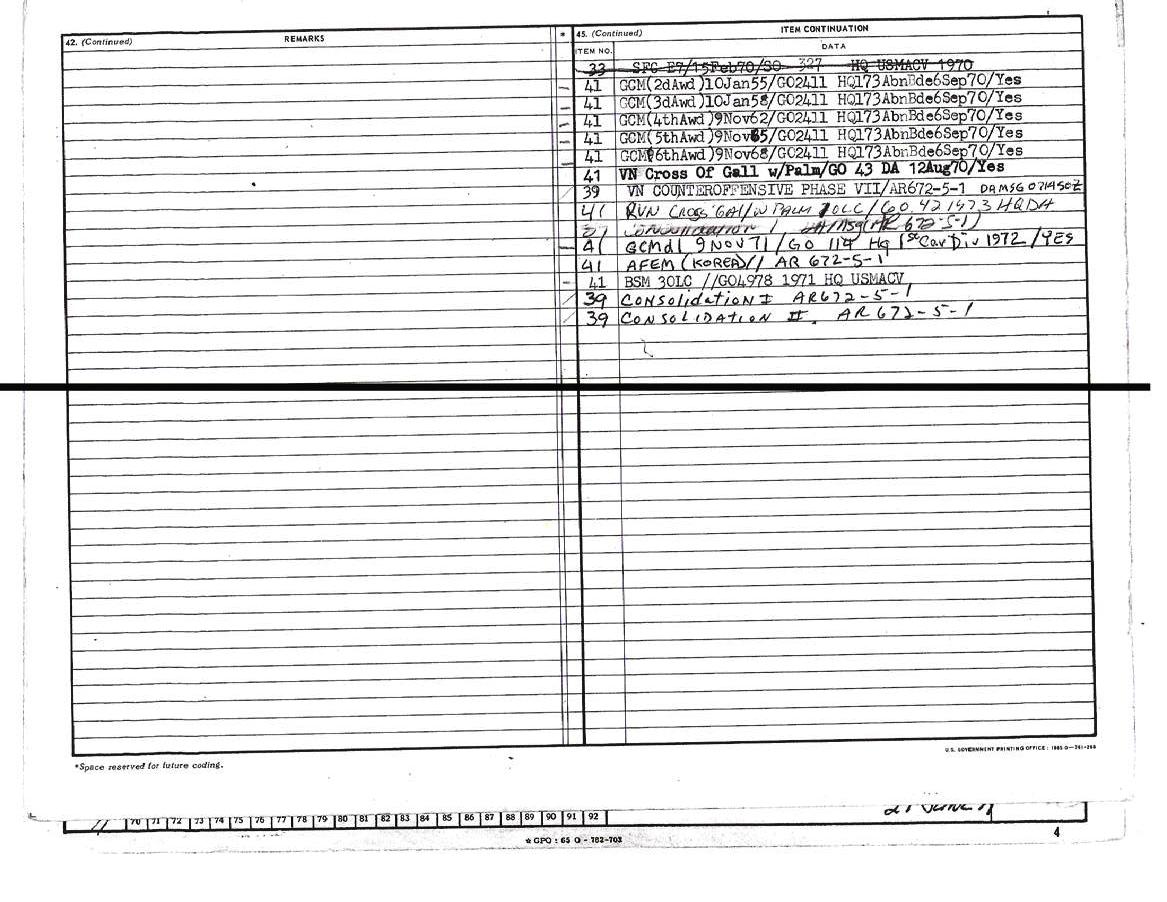Well, it took a month, but we’ve finally got Willie’s records and actually, he had quite an impressive career in the Army. He had several tours in combat as an infantryman in the Dominican Republic and 2 tours in Vietnam. He earned four Bronze Star Medals – all for merit and none for valor even though he’s wearing the “V” on his bronze star – and a Purple Heart in 1968. His tours in Vietnam were with the 101st and the 173rd in ’68 and ’70 respectively – both were airborne units. Here’s his records;
