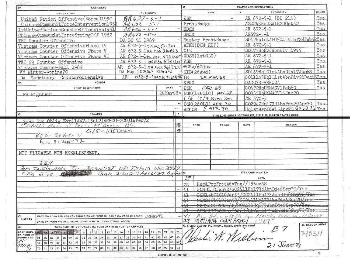 As far as all that goes, I commend him. And, in fact if you go back to the first post, I didn’t question SFC Williams’ awards for combat service – it was all the ancillary BS crap he wore that I questioned – like the glider badge (the school for which closed the year before he enlisted) and medals that didn’t come into existence until nearly two decades after he left the service.