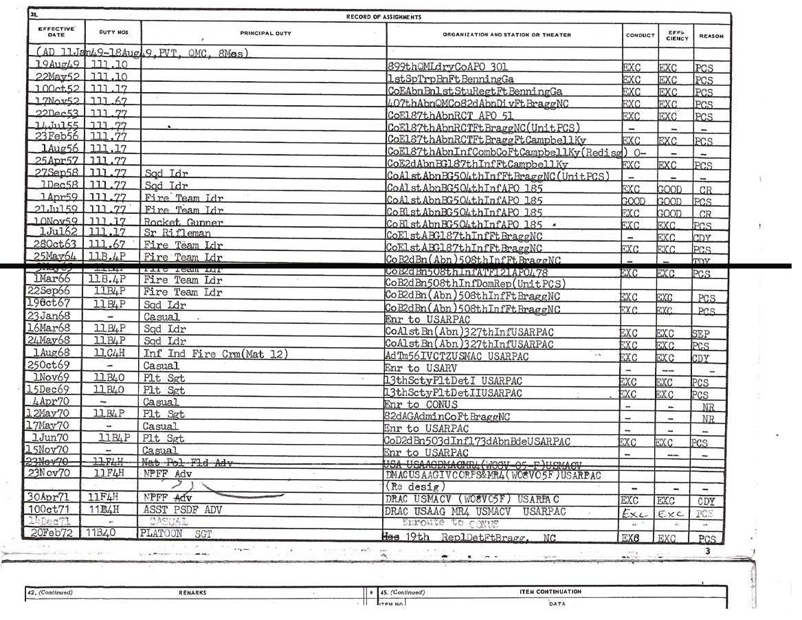 Willie stayed Airborne the whole 25 years, except when he was in Korea where he was in a Quartermaster laundry unit, the 101st and the 173rd in Vietnam and most of his time stateside was with the 101st and 82d – he even PCS’d to Germany for 13 months in 1958-59 with 1/504th to Germany when the unit PCS’d en masse . He went to Escape and Evasion School (the predecessor of SERE School) and the 82nd Division Raider Course (predecessor of Recondo School) – so it’s beyond me why he decided he needed all of the other stuff to pump himself up. And he was only 5’5″ and 123 pounds – he was the original Little Billie Badass.