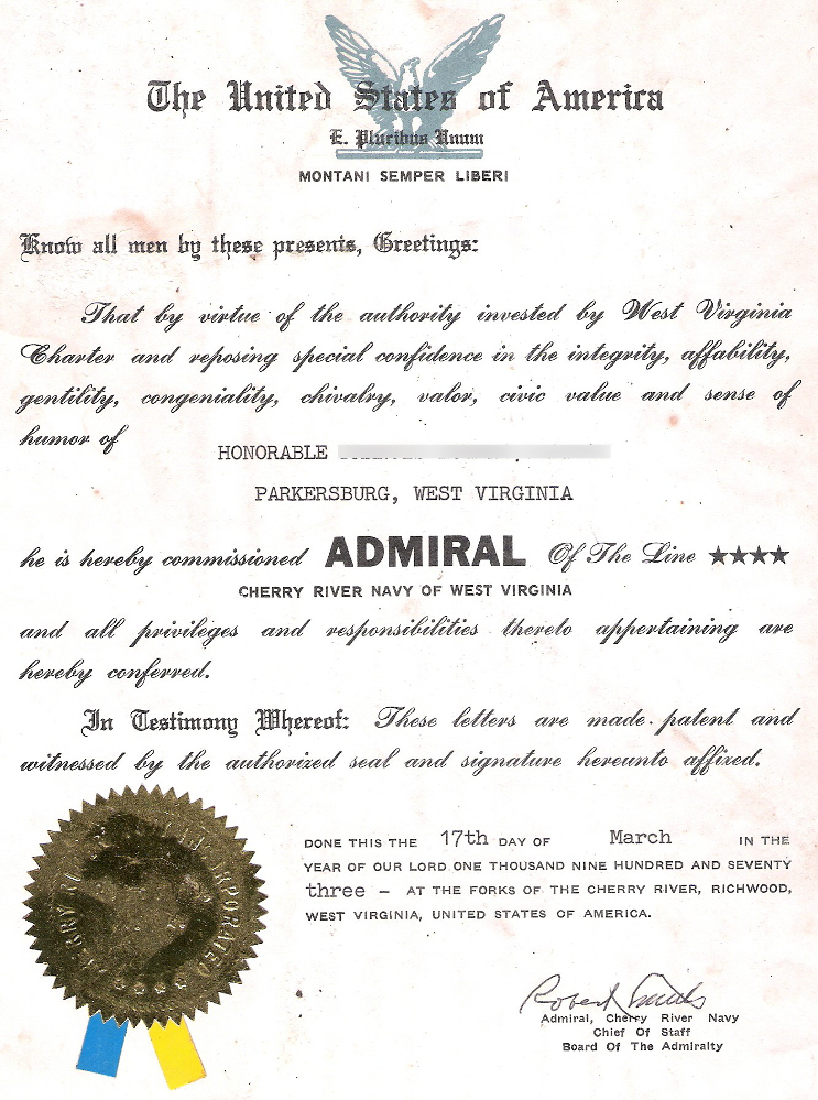 Was digging through some old records and found my Commission. The Cherry River Navy is a super secret organization for those of us with super secret squirrel missions that can’t be discussed among ordinary folk.