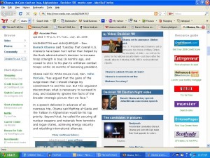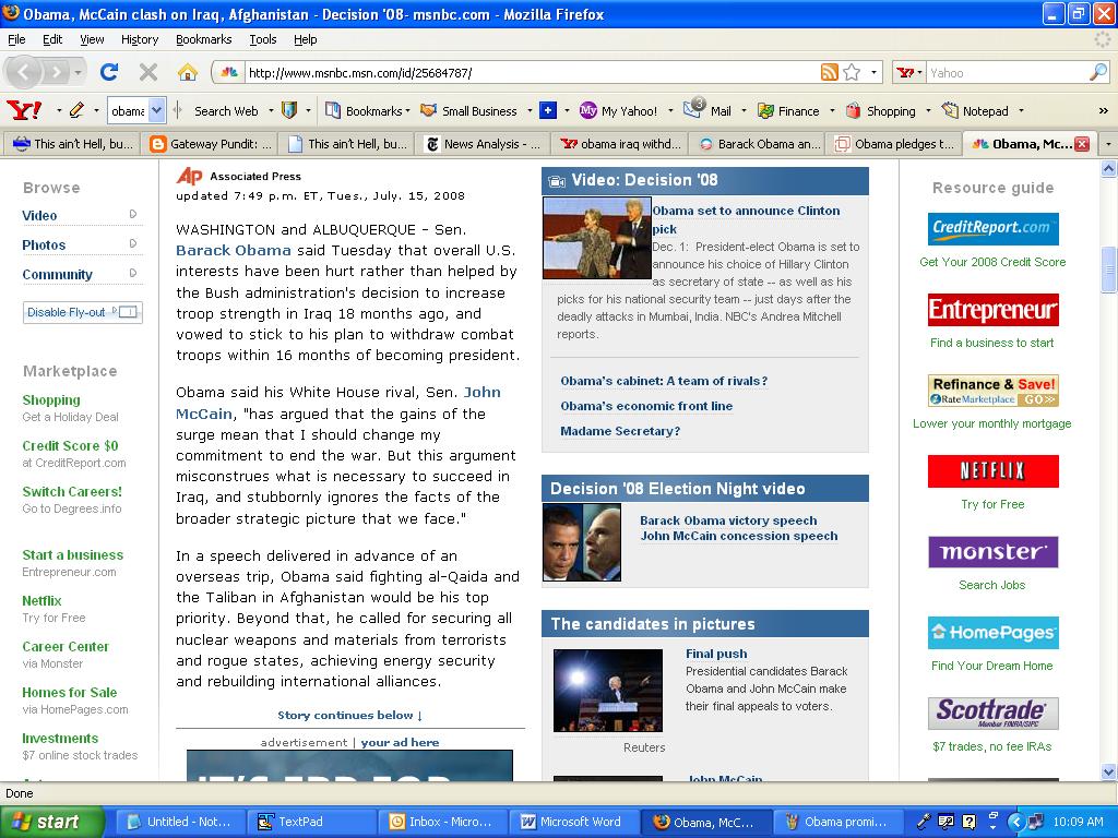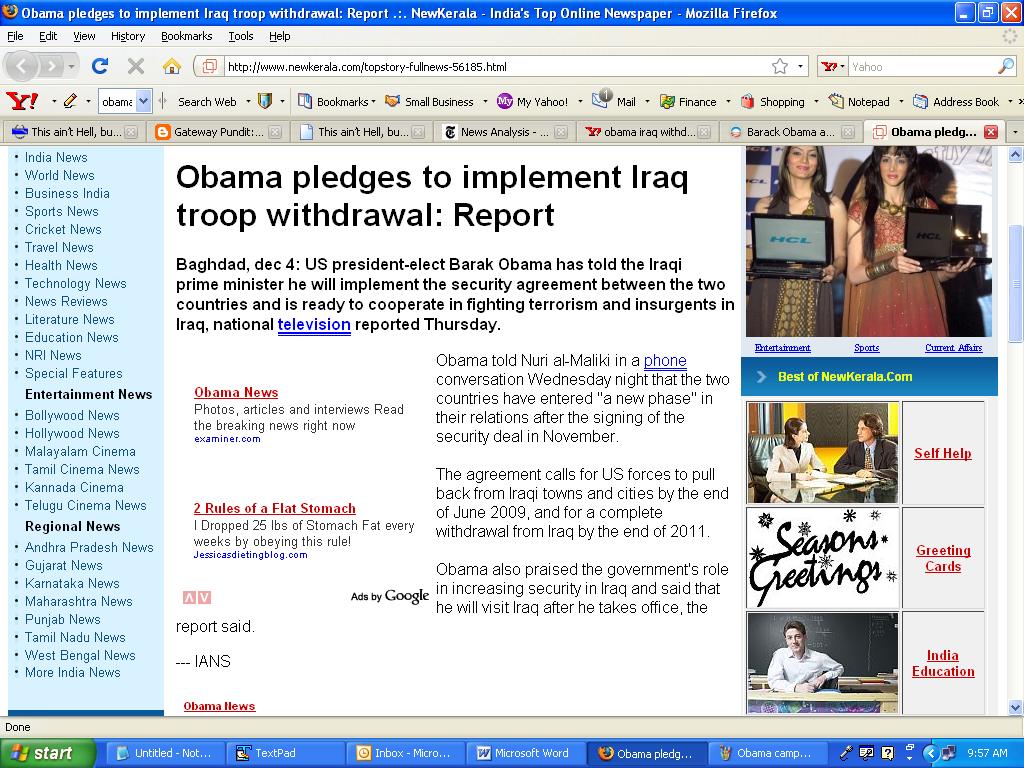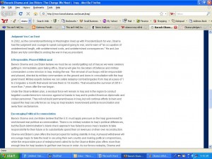 Gateway Pundit, this morning writes that despite Obama’s promises to withdraw US forces from Iraq, he has made no definite deadline for withdrawing all forces from Iraq. The status of forces agreement with Iraq mandates complete withdrawal by the end of 2011, but Obama has been unclear on the size and length of deployment for the residual forces. From his campaign website (I’ve taken to getting screen shots instead of just quotes, because apparently the Obama policy is very fluid on nearly every issue);