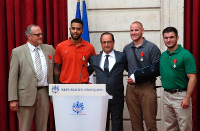 I guess the French recognize heroism when they see it. Just days after three Americans and a Briton rescued hundreds of people from a Moroccan gunman, French President Francois Hollande presented the Legion d’Honneur at the Elysee presidential palace to British businessman Chris Norman, Spencer Stone, Anthony Sadler and Alek Skarlatos. For some reason, he also presented the award to U.S. Ambassador to France Jane D. Hartley, and Hollande called President Obama to thank him, for whatever Obama did to stop the criminal. I guess it’s like when Obama took out bin Laden;