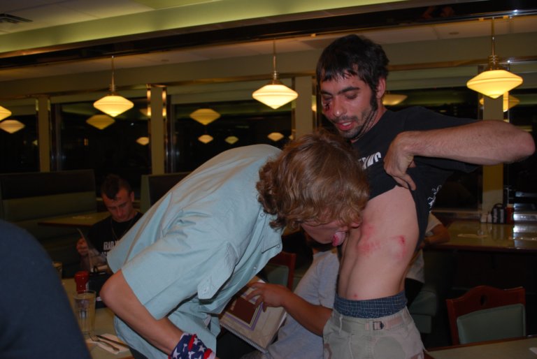 Actually, Chiroux, you’re serving your own ego. He’s been hanging out with Maoists in New York City pretending to be an honorably discharged veteran of the Afghan war who is suddenly jumped by evil Bushists and waterboarded. He also pretended to be occupying the scaffolding outside of the National Archives. How is that “serving humanity”? Or this;