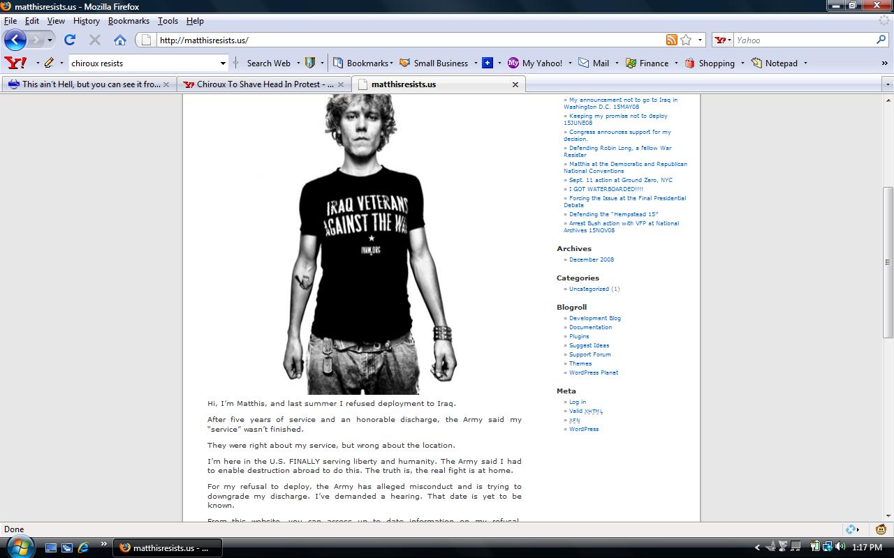 IVAW’s newest liar, Matthis Chiroux who claims he was honorably discharged after five years (have ya’all ever heard of a five-year enlistment?) and also claims he’s a veteran of the war in Afghanistan (with a tour of six days in country) is perpetuating the illusion. He’s started a website from which we can track his daring exploits – oh, and send him money to fight against the Army.