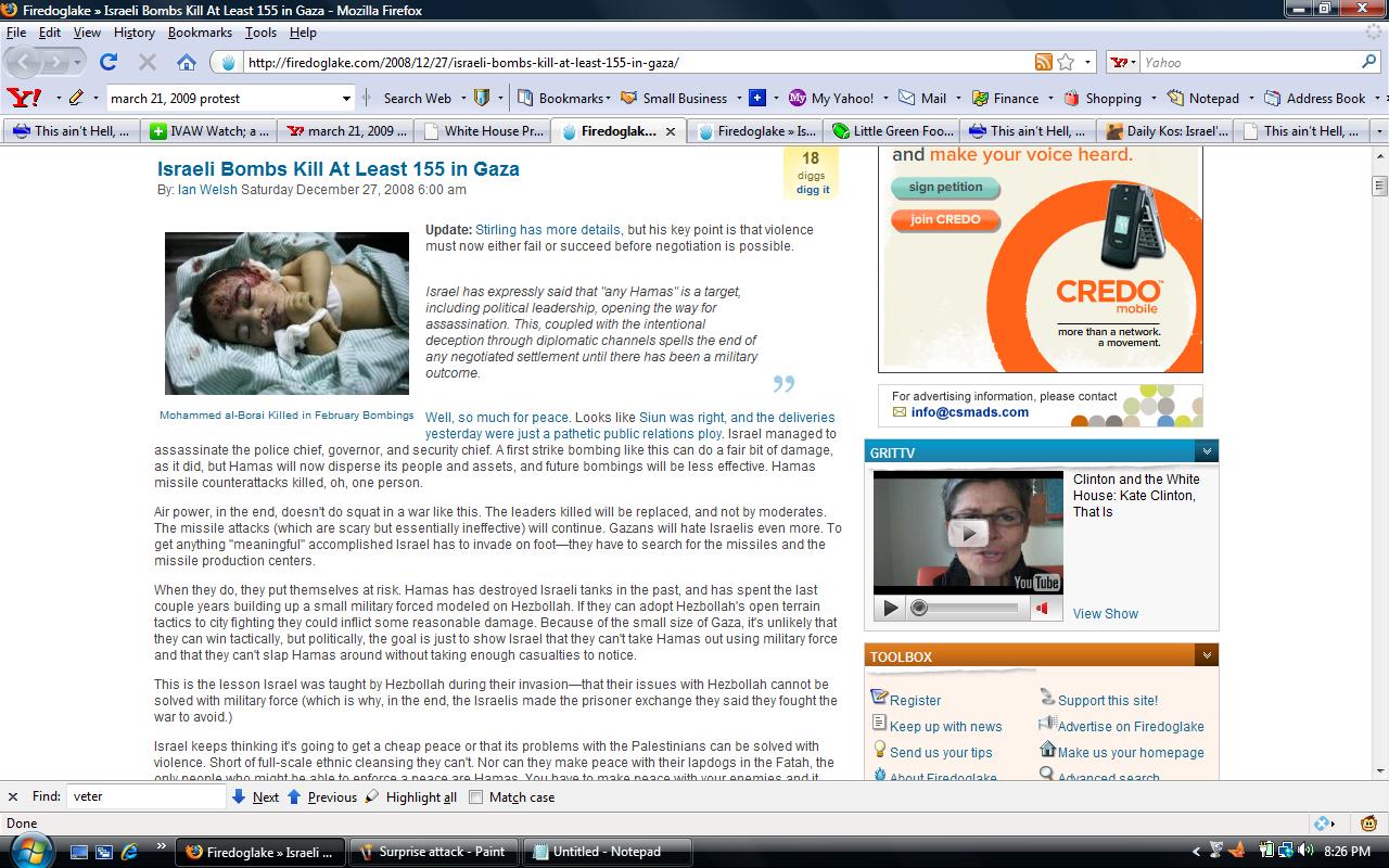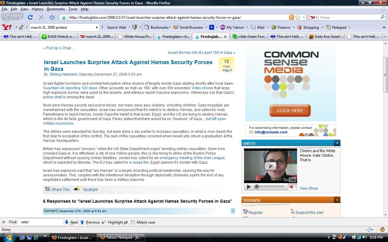 Keep in mind, this is after the Israelis endured six weeks of rocket attacks without returning fire until the ceasefire ended. Not to mention the other concessions Israel has made over the last several years. And even though readers of this blog knew that counter attacks were imminent, one writer at Firedoglake called it a surprise attack against Hamas;