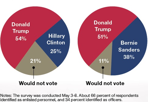 The folks at Military Times took a poll of 951 troops (66% identified themselves as enlisted service members) and found that more than 50% would choose Trump over Clinton who attracted 25% of military folks. 21% said they wouldn’t vote if those were their only choices. Bernie Sanders does better in a Trump/Sanders match up, garnering 38% and 11% voting with their feet.
