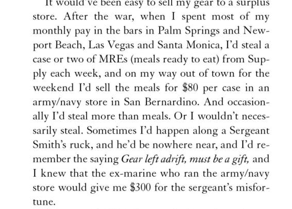 I read constantly, and there’s only been one book I hated so much that I actually tore it apart so no one would inadvertently stumble upon it and read it. And that was Swofford’s asinine book Jarhead. And I destroyed it on page 2. On that page, he talks about how he stole unsecured stuff from fellow troops to sell at a surplus store. I don’t know what unit this clown served in, but in mine, that’s the sign of a blue falcon. If an NCO sees something unsecured, you jack the troop up, you don’t take his stuff and sell it so some asshat can have extra gear to play paintball.