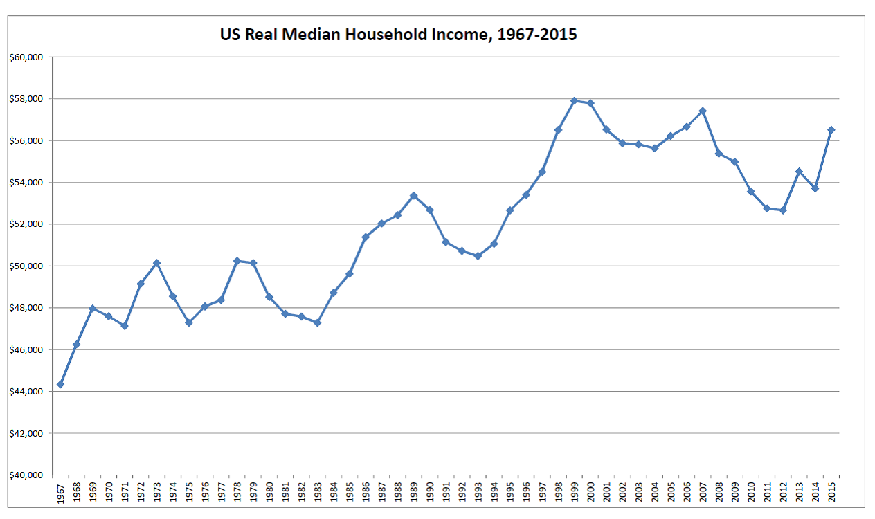 The first chart very well shows the effect of inflation. Depending on which inflation index is used, a dollar in 1967 had the same purchasing power (e.g., bought the same amount of “stuff”) as somewhere between $6.30 and $7.00 today. However, household incomes have also gone up even more. The chart accurately shows that people are better off today – just not 700% better.