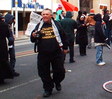 Recognize the pudgy little shit in keffiyeh? It’s Veterans For Peace chief coward Bill Perry who I wrote about last month. He was involved in the protest against Israel last week in Philadelphia. I guess he did such a bang-up job of getting the US troops pulled out of Iraq, he figures he can contribute his considerable weight to the effort to get Israeli troops withdrawn from Gaza. He was so full of himself after participating in this protest, he penned a long letter to the Veterans For Peace National Office to urge them to action against Israel. But those dirty Zionists keep getting in his way;
