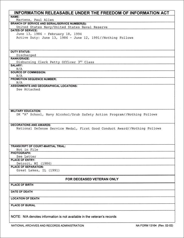 Paul Allen Martins was a Disbursing Clerk and an E-4 at discharge. He should have just been proud of the service that he did have.